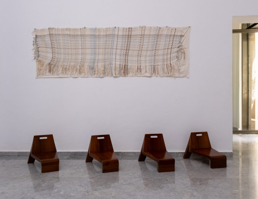 Installation view with weaving by Rym Beydoun( Côte d’Ivoire) and wooden chairs by Amivi Homawoo (Togo)