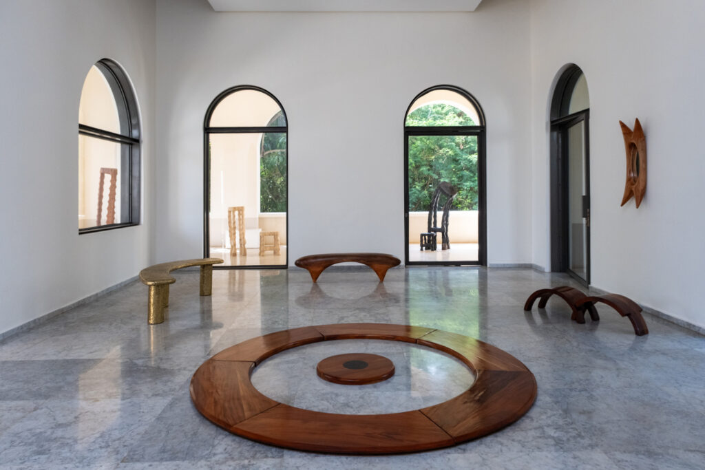 "Design In West Africa: Unity in Multiplicity," Installation view includes work by Kossi Hemadzro Assou (Togo), Circular eating Assembly and acrylic varnish, 240 x 240 x 40 cm and Estelle Yomeda, Animal Vegetal, Zo, 2025, Neem wood, hand sculpted, flame finished, walnut shell, 40 x 160 x 35 cm