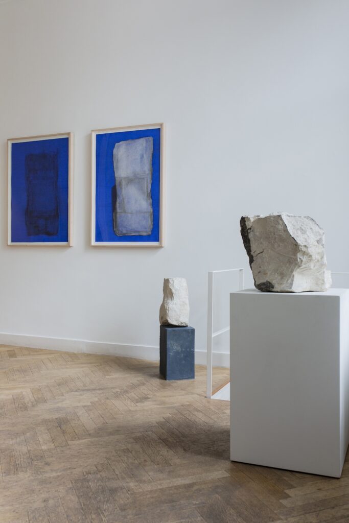 Not forgetting carborundum, the black of black, an almost living material whose grain creates depths of tone, nuances, gradations, half-tones and tremors of colour. Radical and determined, Garcia plays with a chromatic range of greys, blacks and whites, punctuated by a blue that resonates in infinite variations, syncopations and jerky rhythms, as if echoing Brahms and his Variations on a Theme of Paganini. And to the graduated half-tones of Tony Cragg’s First Era or the blacks, whites and greys of the zips engraved on copper plates in Notes, and Barnett Newman’s Untitled #1 and Untitled #2 series. Engraving, then, is the main focus, but also, in resonance and dialogue, stone. Criss-crossing the Dordogne, a land as raw as it is gentle, made up of rocks and forests, ravines, valleys and limestone cliffs where Lascaux meets Bara Bahau, Eva Garcia discovers raw blocks or blocks that have had a function, like old door lintels, remnants, fragments of stories and narratives that have gone before us and that are still here in other ways. Recovered block-sculptures that bring into play almost the same processes as the act of engraving. From directly carving onto limestone blocks, to the engravings Temps du vertige, Corps lourds, Pierres angulaires, No lasting forms and Enjambées, not forgetting the Présence series, Éva Garcia develops sequences, plays on and with the principle of repetition, and creates series that she unfolds like so many musical movements. In her two practices: weight, density and texture. In her two visions of the world: the presence of the cut-up, fragmented, disjointed body, and always the presence of stone. As in Giovanni Anselmo’s granite Untitled, Richard Long’s Cornish Stone Circle, Ulrich Rückriem’s Menhirs or Andy Goldsworthy’s Nettle Stalks Wall. From engraving to sculpture, from solid colours to volume, there is always a relationship to the body, to gesture, to the hand, all at the same time. And at the same time, Garcia sets in motion a relationship with the cerebral, with questioning and analysis.