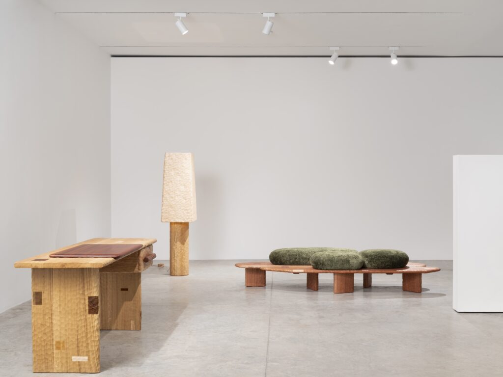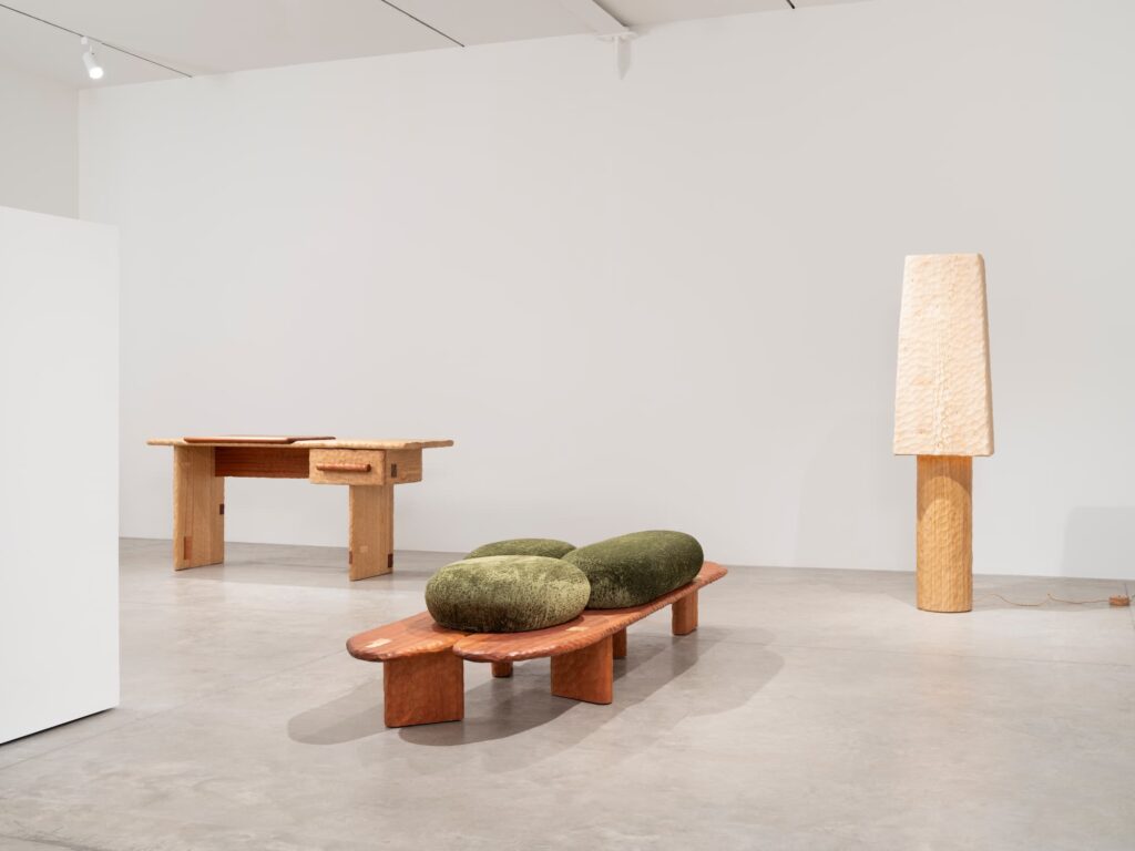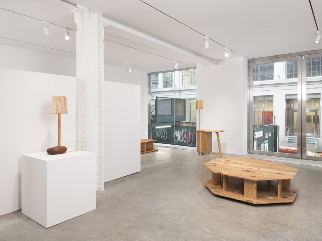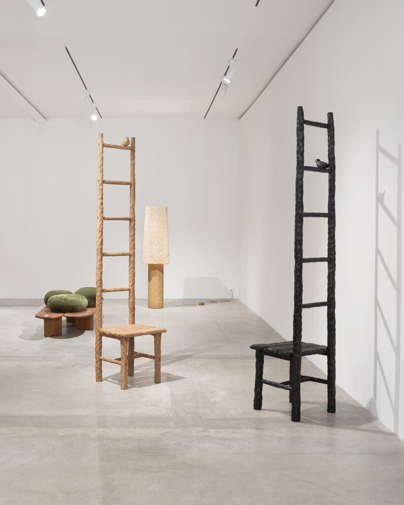 Born in Dijon in 1987, Babin studied Space Design at the ENSA in Dijon, before relocating to Japan’s Nagoya University of Art & Design, where he came to recognize that architecture was not the right scale for his ideas and shifted his focus decisively toward objects. Early in his career he gained wide recognition with the Lunaire lamp for Fontana Arte, which was a graduation project that remains in production today. More recently, Babin moved away from industrial design to make things entirely by hand, beginning with carved wooden spoons before expanding into larger sculptural furniture. Works in the current exhibition include oak chairs, sideboards, shelving structures, and tables, several incorporating stoneware and wood inlay.