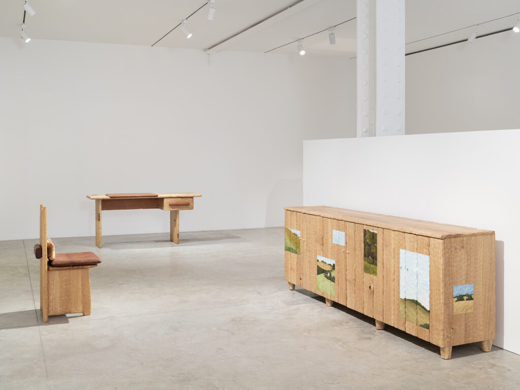 For this new body of work at Friedman Benda, Banin adds painting into the mix. For the artist, picking up a brush is not a departure but an extension — another way of processing the French countryside that surrounds his workshop and inspires him daily. Working with timber from neighbouring forests, he treats the wood surface as a canvas, distilling what he sees in the landscape into colour and texture. The results sit somewhere between functional object and plein air painting: a sideboard becomes a stage for rolling hills and open skies; a cabinet door holds a fragment of horizon. The collection connects to folk art traditions, yet stands firmly within a contemporary context.