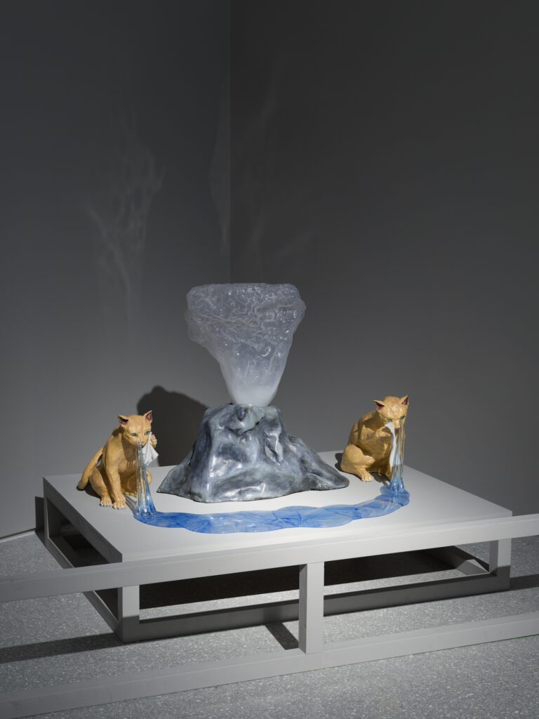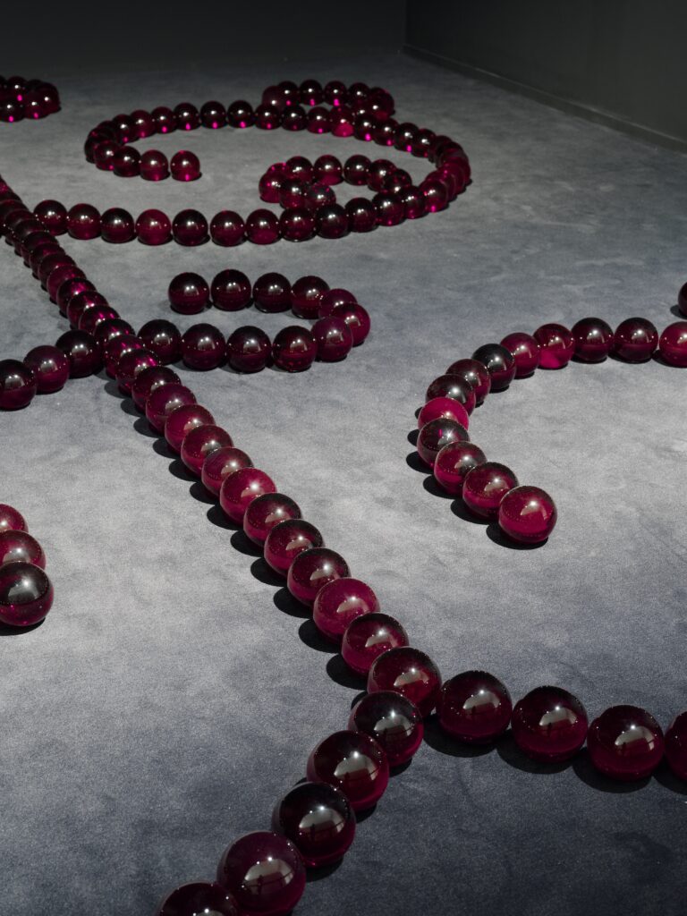 Highlights of the exhibition include James Lee Byars’s Le Petit Ange Rouge de Marseille, an arabesque of 333 equally sized glass spheres arranged across the floor – the deep “Venetian red” was created from a formula that was passed to Cirva by a Venetian master. A series of 77 vases by Robert Wilson, feature a varying thickness and surface treatments that are calibrated to evoke specific natural light conditions: fog, moonlight, a stretch of still water. Jean-Michel Othoniel’s Contrepets, cast from synthetic obsidian produced after Cirva’s team successfully simulated volcanic eruption conditions in a laboratory; And Betty Woodman’s glass vases, developed during her Cirva residency, offer a fascinating counterpoint to her celebrated ceramics practice: the same formal vocabulary, rebuilt entirely in transparency.