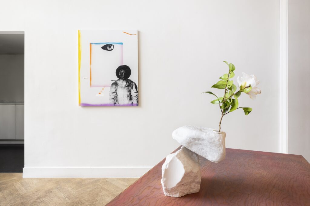 By bringing together applied arts and contemporary fine arts, this exhibition, “Crush,” raises the question of attachment and humanity’s place in relation to the artwork. What is the status of the work of art? If philosophical theory can become, for Benoît Maire, an aesthetic medium—the “cosa mentale” that leads him to create functional objects and paint canvases—it is fascinating to see how he interacts with his collaborator and partner Marie Corbin within “a scenography of the world” that belongs to them. In her “Calme” vases made of Limoges porcelain, delicately painted and glazed in a third firing with gold, like precious abstract and narrative paintings, or in his highly sculptural “Pierre” vase, transcending the fragile presence of a river stone by transforming it into a single-flower vase, Marie Corbin’s sensitivity complements Benoît Maire’s vision.