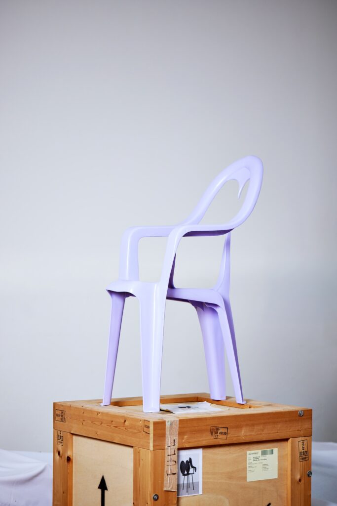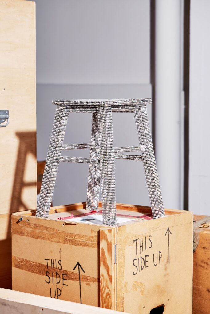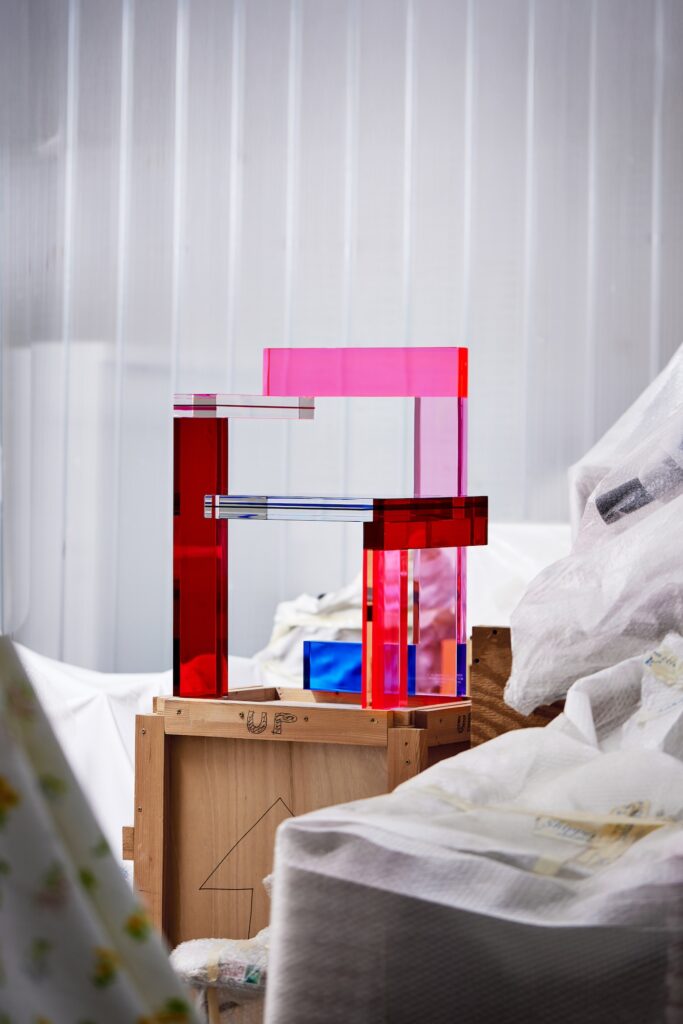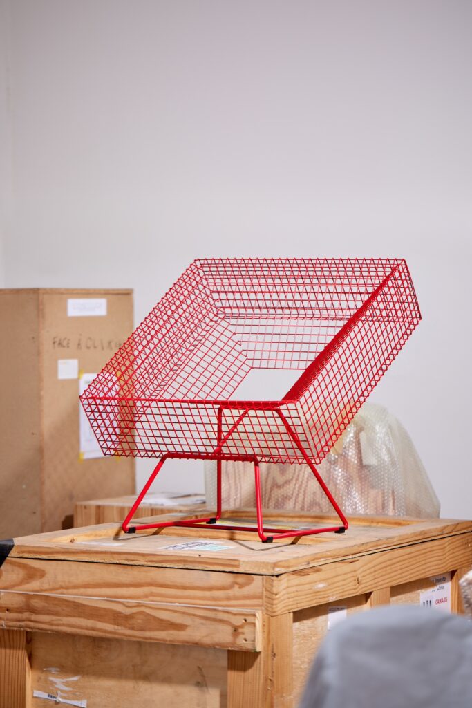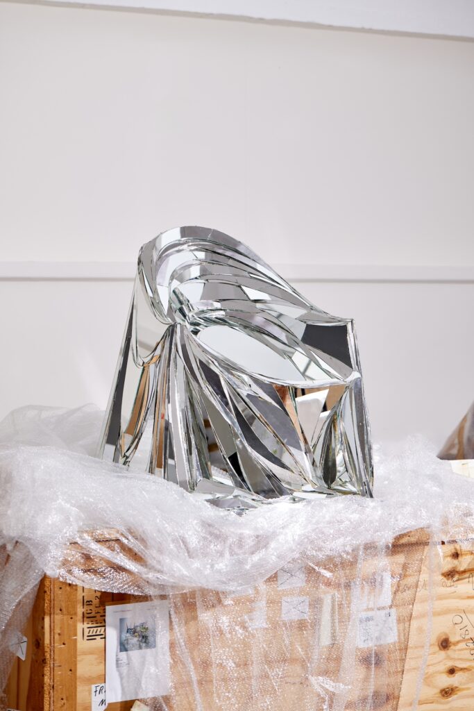At Matching Seats, chairs are seen in a variety of mediums from plastic to wire mesh. Highlights include the prototype that led to the Mutation Series by Brussels-based designer Maarteen De Ceulaer that features multiple stacked spheres. German designer’s Kai Linke humorous approach to the standard plastic garden chair to make it seem as if it came out of an AI machine. Sofia Leitão used mirror shards to create a seating sculpture, while the Italian Anna Monichi crafted a chair from Barbie parts.