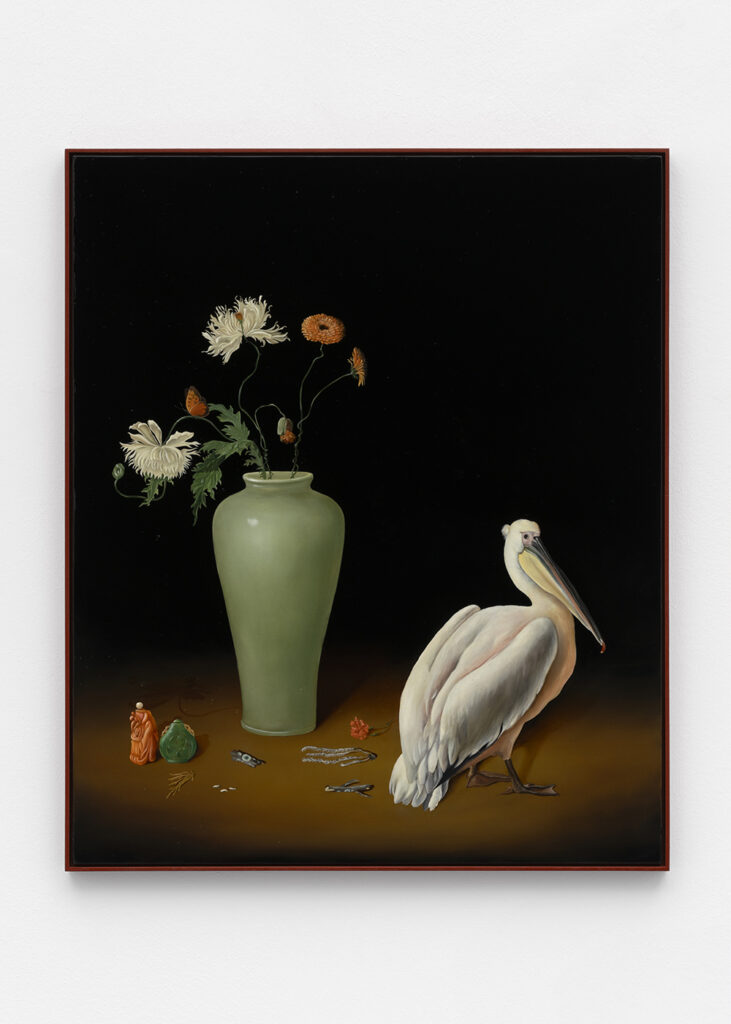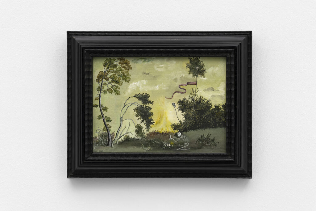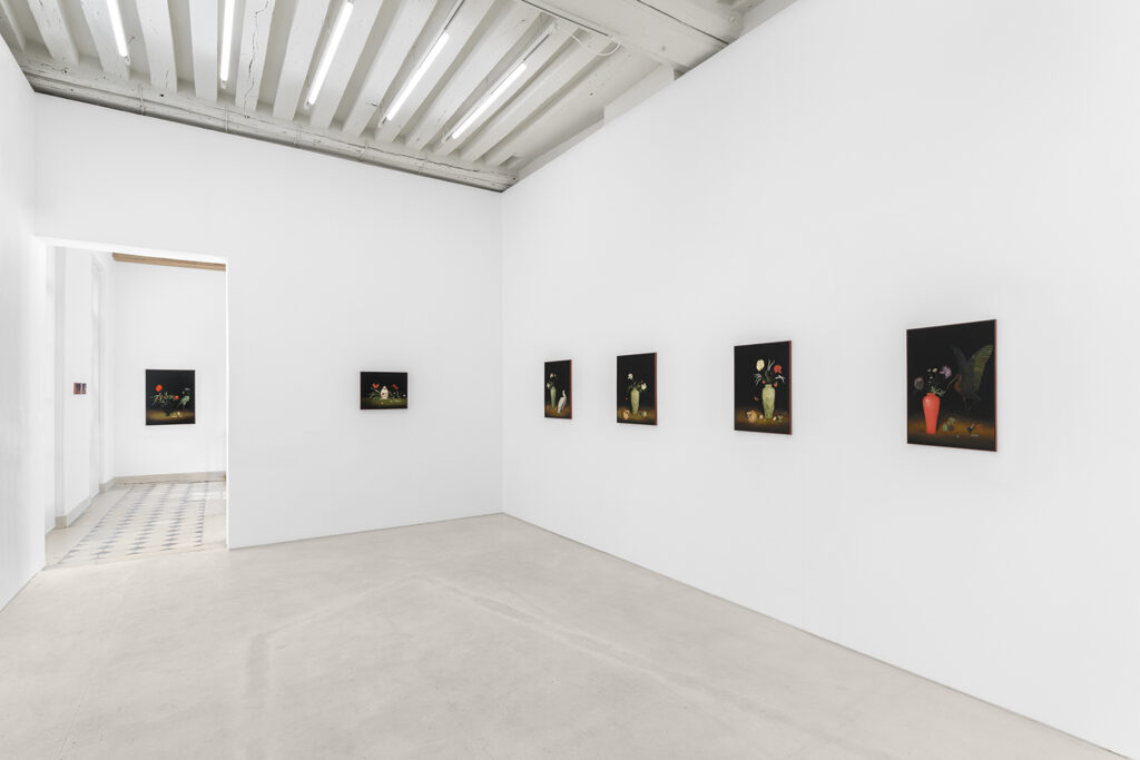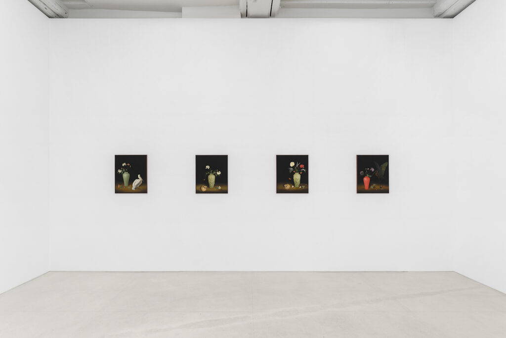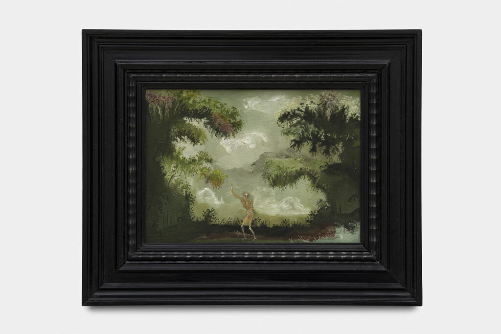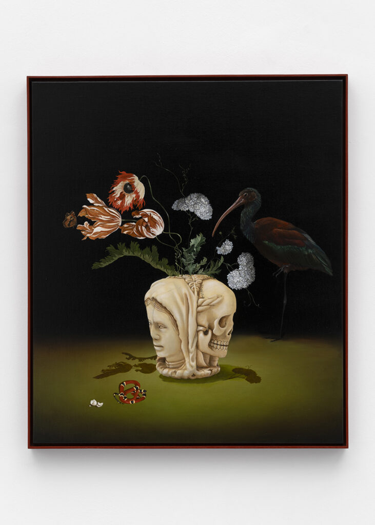 The paintings in The Hunger, which are installed across the two-floor gallery space, reflect an untamed nature, one buzzing between good and evil. Khatibi’s Nature, with a capital N, is a dominant and primal force. In some instances, it’s as if the landscape is about to wrap and weave its way over the tiny humans or skeletons that lie within it. Khatibi trained as a falconer, which perhaps gives her an added intuition when it comes to painting the wild birds and animals found across many of the paintings on view. Beautifully painted plump and plush feathers of exotic looking birds engage with lushly saturated flowers, and moody, tempestuous skies, all of which signal some kind of change, shift or omen. As Martha Kirszenbaum writes for the exhibition’s text, “Sanam Khatibi’s practice oscillates between a fascination for human violence and the macabre, and the flamboyant representation of an idyllic nature bathed in soft light and lush with vegetation. Her works explore themes of animality and primal instincts, making us tread that fine line between fear and attraction, chaos and seduction.”