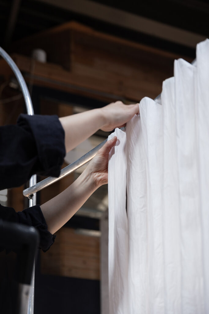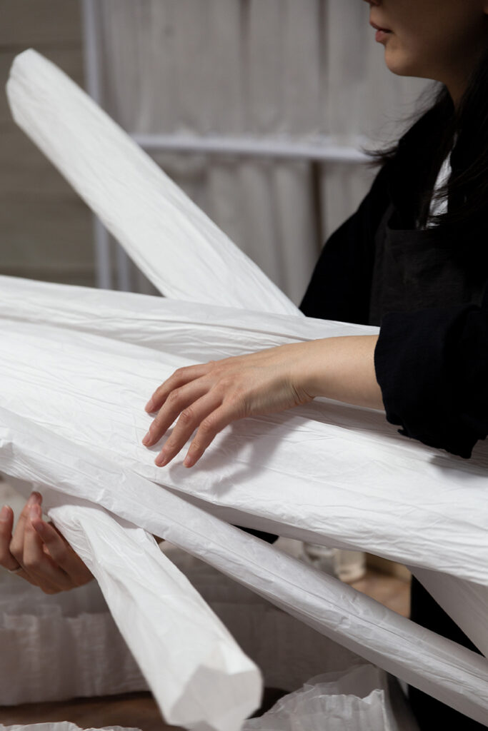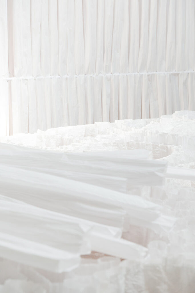 This art installation dissolves the borders between sculpture, architecture and contemplative space. Within the visionary framework curated by Devrim Bayar, it departs from the traditional booth format and unfolds instead as an experiential journey: a luminous interior of a white contemplative chamber, anchored by the Paper Pleats Bench.