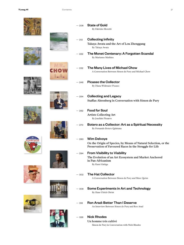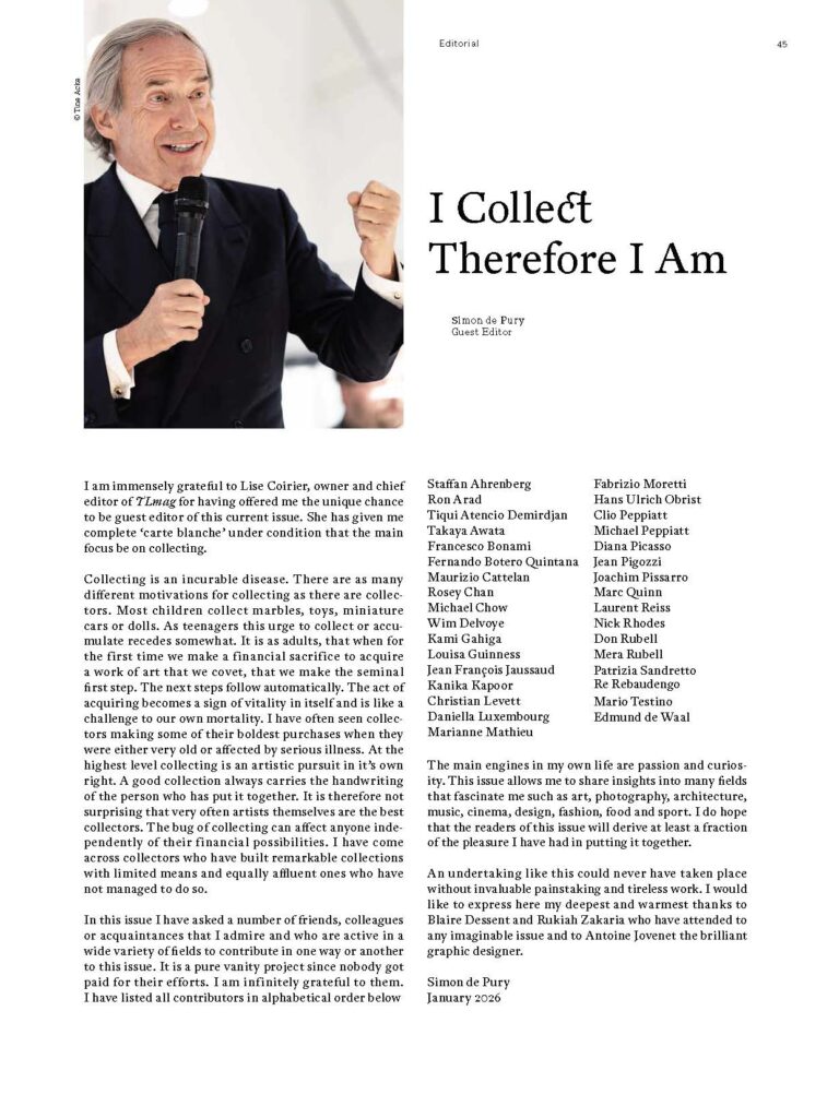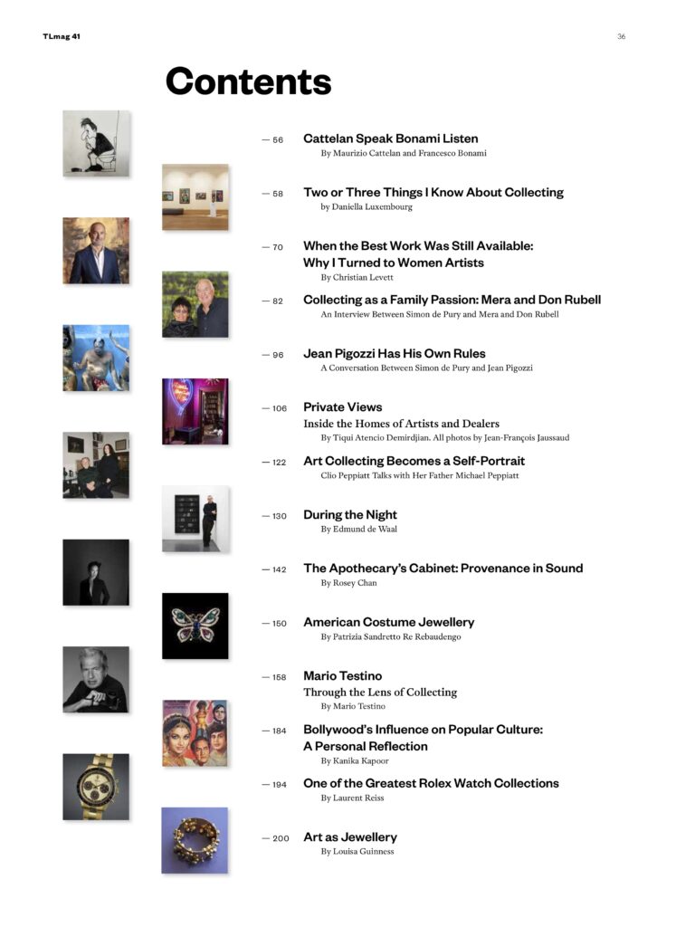 We are pleased to announce the release of our 2026 print edition: TLmag41: The Art of Collecting, guest edited by Simon de Pury. “Collecting is an incurable disease. There are as many different motivations for collecting as there are collections,” writes de Pury in his opening editorial to the 320 page issue. With interviews, articles and personal reflections by some of the world’s leading collectors, from costume jewellery to contemporary art, TLmag41: The Art of Collecting, explores the many facets of this distinct obsession. The full list of contributors includes: Staffan Ahrenberg, Ron Arad, Takaya Awata, Francesco Bonami, Maurizio Cattelan, Rosey Chan, Michael Chow, Lise Coirier, Wim Delvoye, Tiqui Atencio Demirdijian, Kami Gahiga, Louisa Guinness, Kanika Kapoor, Christian Levett, Daniella Luxembourg, Marianne Mathieu, Fabrizio Moretti, Hans Ulrich Obrist, Clio Peppiatt, Michael Peppiatt, Diana Widmaier Picasso, Jean Pigozzi, Joachim Pissaro, Marc Quinn, Fernando Botero Quintana, Patrizia Sandretto Re Rebaudengo, Nick Rhodes, Don & Mera Rubell, Laurent Reiss, Mario Testino, Edmund de Waal