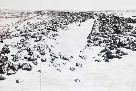 A large stone sink which overlooks the foyer is surrounded by shelves – made from European oak untreated blackened steel – the latter references the storefront’s original facade.