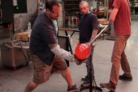 “As always, in order to evaluate the implementation of his ideas, Peace took care of the first tests himself,” explains Françoise Guichon, one of the curators of the exhibition and the director of CIRVA at the time. “Wearing a city shirt with perfectly starched cu s and protected only with a large glove of reproof material, he held a pistol at arm’s length that red molten glass onto a support placed within the roaring red throat of a wide-open furnace.” Thanks to this curious spirit, the exercises yielded first-time industrial applications, such as the addition of coloured patches in the production of glasses.
