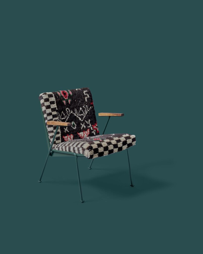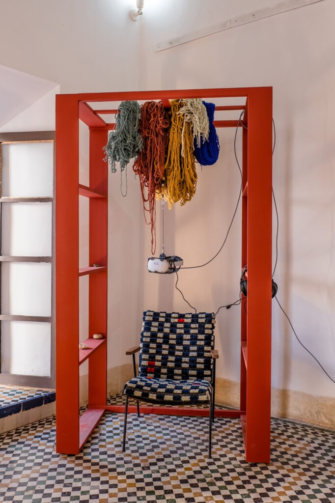 Wanting to tell these incredible stories of weaving and to shed light on the talent of these women, Abouzahra curated “The Soul of a Rug”, an exhibition on view at the Palais Bahia in Marrakech through June 30th. It features a selection of weavings and tapestries from the weavers of Taznakht, along with contemporary furniture and objects designed by Abouzahra, and some vintage furniture, onto she used the weavings as upholstery. The exhibition also features photographs, looms and yarns that people can touch and feel, allowing them to get more connected to the process and technique that goes into each rug. In addition, Abouzahra made a VR film for “Soul of a Rug” that takes visitors directly to Taznakht, where they are immersed in the daily life of the women and the village.
