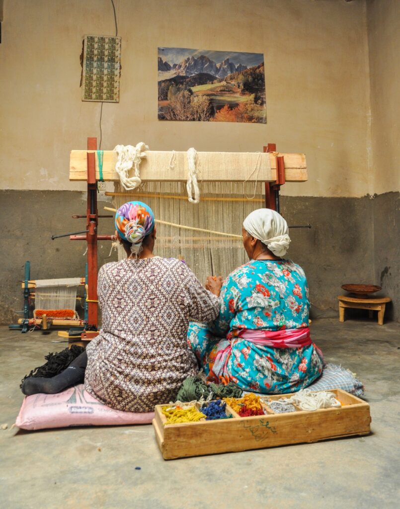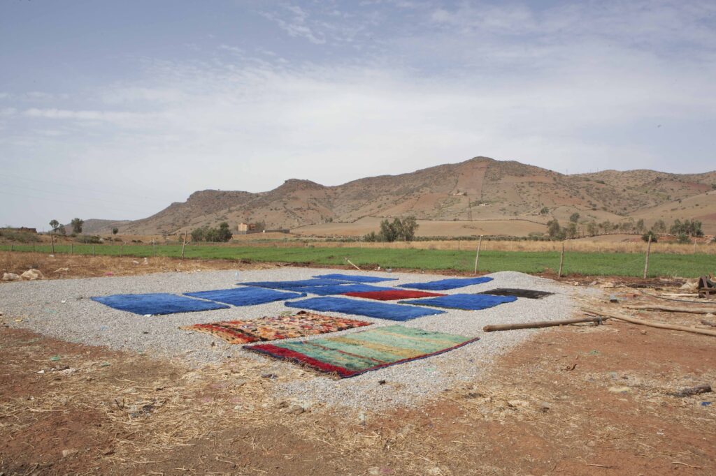 “One Square Meter Berber,” was her first exhibition at the Palais Bahia in 2019, which not only highlighted the talent of these weavers but also the harsh realities of the disparity in how they are paid relative to others in the supply chain of woven rugs. The title “One Square Metre” comes from the way the women are paid for their work, by square metre. Installed on the walls of the Palais Bahia were 1-square meter rugs and next to it, a photo of the woman who made it. The idea was to give context and understanding, to show that these were talented people who deserved better financial compensation for their work. During this time, she also invited a few Dutch designers – a fashion designer, artist, product designer – to Taznakht for a residency and exchange, where they worked with the Amazigh weavers and developed new projects, which were also exhibited at the Palais Bahia.