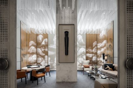 Located near Xuzhou in Yunlong Mountain – whose name originates from its nine dragon-like peaks – the Yunlong Club is another example of Virginie Moriette and Ming Xu’s penchant for the exploration of opposites and of the notion of balance. Here, nature and culture, inside and outside, eastern elegance and contemporary chic, past and present coexist to create a new type of cosiness perfectly in tune with the surrounding environment. The club is divided into three floors. A lounge and restaurant on the ground floor, and a reception area on the first floor, are visually linked by a clever use of transparent partitioning that conveys a sense of airiness and openness. This feeling is also present in the large floor to-ceiling windows connecting the restaurant spaces with the sunken exterior courtyard decorated with many green bamboo plants. The upper floor is occupied by meeting rooms and private dining rooms, all framed by a ceiling reminiscent of the original pitched roof from modern Huizhou architecture. The rooms are furnished with simplified – thus more suitable to commercial use – versions of Studio MVW’s classic Cotton and Louis Ming Chairs. The notion of integration goes beyond the geographic or topographic aspects to incorporate a strong cultural dimension, particularly perceptible in the use of materials. Bronze, which is associated with the craftsmanship and cultural heritage of the Chu and Han dynasties and notably with the city of Xuzhou, is extensively used throughout the club to reinforce its connection with its historical and local context. On the third floor, a bronze chandelier evokes the bells found in Ancient China while copper, which is used in the round barrel stools of the reception area and in the lamps of the bottom floor, infuses the spaces with warmth and gives them a very special patina. Another strong component of the club’s architecture is the recurring play on light and shadow. The windows in the reception area, which open onto a view of the South Lake, feature an “ink painting” of the mountains made of laser-cut aluminium plates that let in natural light during the day and becomes a modern landscape painting at night, as the light coming from inside turns it into a photographic negative. On the other side of the room, a digitally synthesized bamboo image covers the glass delimitating the staircase, echoing the themes of nature and light. Perforated panels on the ceiling of the top floor reiterate lighting effects and evoke a mashrabiya-like, modern artwork. Envisioned as a core element of the architecture, light is neither just functional nor ornamental, it is also used symbolically to convey the idea of a strong vital force, an energy coming from the past and projecting the space into the future. The traditional candlestick, which inspired the design of a specially made copper hanger, evokes permanence and change through the image of a flame – a felicitous choice for a club whose design is anything but frozen and materialises all at once the roots of yesterday and the energy of tomorrow.