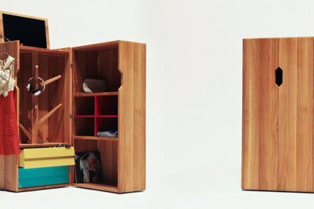 ‘Trunk’ by The Hansen Family is a simple two box construction which splits open to reveal dresser drawers, cupboard shelving and a unique rack-like hanger!